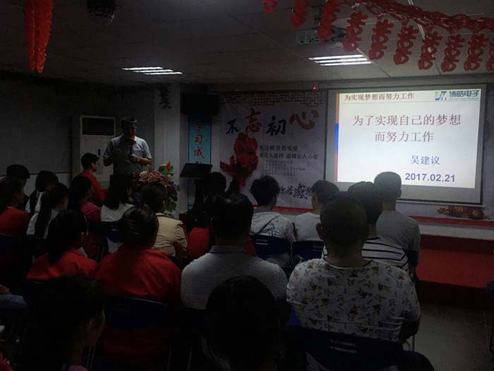 2017年2月21日晚上8點(diǎn),在博皓電子四樓培訓(xùn)室進(jìn)行了一場特殊的內(nèi)訓(xùn)會議!參加培訓(xùn)的六十多位人員全是博皓硅膠制品廠新進(jìn)入的家人!由博皓電子的總經(jīng)理吳總親自與所有新加入博皓電子的家人進(jìn)行一場高品質(zhì)的企業(yè)文化宣導(dǎo)!