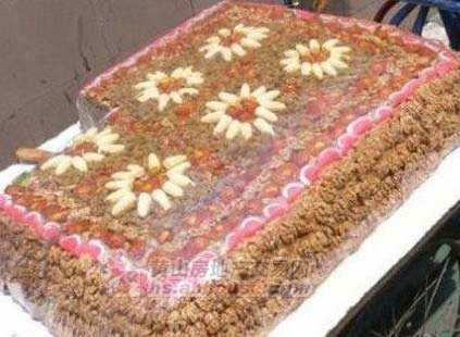 切糕包括核桃、花生、葵花籽、葡萄干、杏干,其實就成本上來說也不算便宜,但也不算多貴。主要靠糖粘合;趁熱將它倒進(jìn)一個很結(jié)實的木槽之中(木槽由幾塊單獨的厚木板圍成,用粗麻繩和兩頭彎的大鐵釘固定在一起),再用一塊厚木板蓋在切糕上面,木板上面再壓上一些重物,比如石塊或鐵塊,總之要夠重夠分量,大概要4、5個小編的重量才行。就這樣切糕慢慢得被壓到很緊實,里面很多水分也隨著木槽底部的縫隙慢慢流出。兩天之后,移開重物或者小胖們,再撬起鐵釘,解開麻繩,取下木板,一塊結(jié)結(jié)實實,香氣四溢的切糕就呈現(xiàn)在我們眼前了。