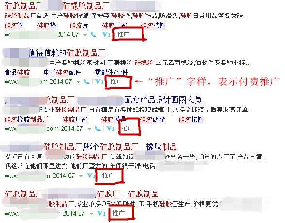 如下圖中:通過(guò)搜索“硅膠制品廠”而出現(xiàn)的鏈接里有“推廣”兩個(gè)字的,則說(shuō)明這家企業(yè)是通過(guò)付費(fèi)使這條鏈接出現(xiàn)在了首頁(yè)。