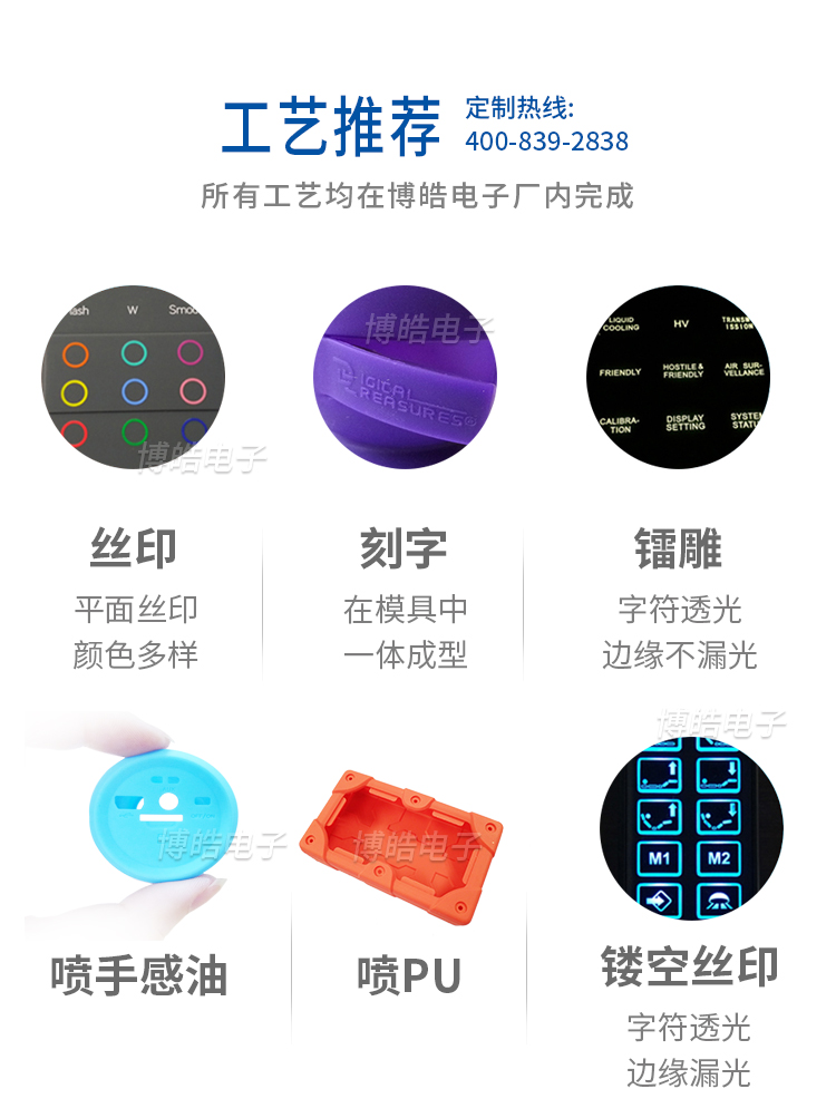 多色成型、碳粒成型、塑膠注塑、背面絲印、套色絲印、點印導(dǎo)電、移印導(dǎo)電、表面噴涂、激光鐳射 激光鐳雕、套色遮噴、噴PV保護(hù)油、噴UV保護(hù)油、滴膠、P+R組裝。 |