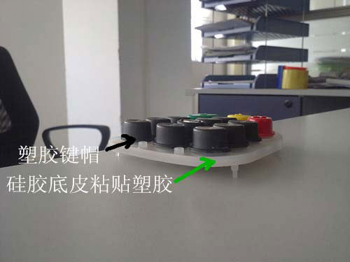 這款產(chǎn)品就是一款典型的P+R按鍵,產(chǎn)品包含上面三種顏色的塑膠鍵帽,塑膠鍵帽的字體是通過表面移印字符的,然后再通過底部的硅膠內(nèi)襯按鍵和塑膠鍵貼合而成的硅膠制品。