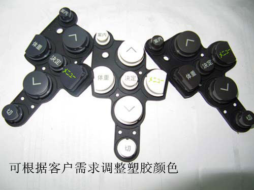 產(chǎn)品是出口日本的體重測量儀按鍵,主要是采用硅膠做成彈性襯托表面增加塑膠按鈕的一款P+R結構設計特點。表面的塑膠鍵帽可以根據(jù)客戶的需求進行顏色的調整,呈現(xiàn)多種多樣的硅膠制品外觀圖。