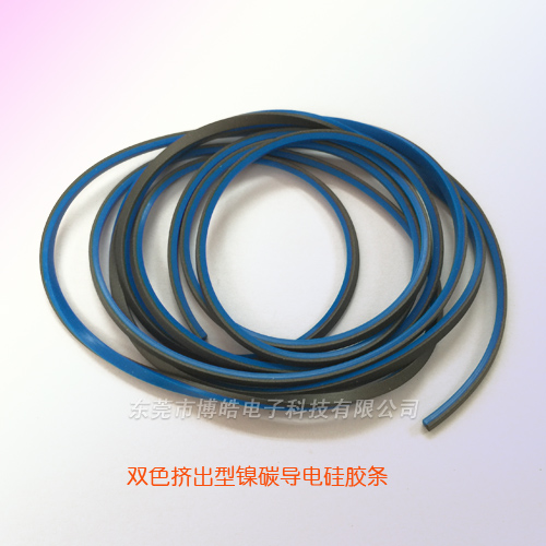 | 產(chǎn)品名稱(chēng) | 碳鎳硅膠+藍(lán)色硅膠雙色擠出成型導(dǎo)電硅膠條 |
