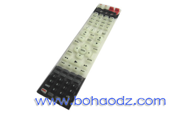 - 產品簡介:此款遙控器按鍵,除采用傳的生產工藝:成型、絲印、噴涂外,其主要特色是,在硅膠原料中加入了一定比例的熒光粉,使用按鍵在黑暗的環(huán)境下發(fā)出夜光,這樣一來,晚上看電視不開燈也能正常使用遙控器了,這種設計對于喜歡關燈看電視的那一部份人群來說,不得不說很是貼心。